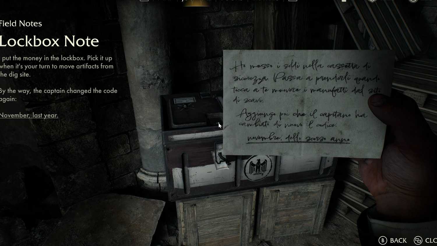 O código para abrir o baú é 1136. No entanto, você pode optar por descobrir a solução por conta própria. Para isso, pegue a Nota do Cofre do soldado que você derrubou no porão. Essa nota menciona que o código foi alterado pelo capitão e fornece uma dica importante: “Novembro, Ano Passado”.