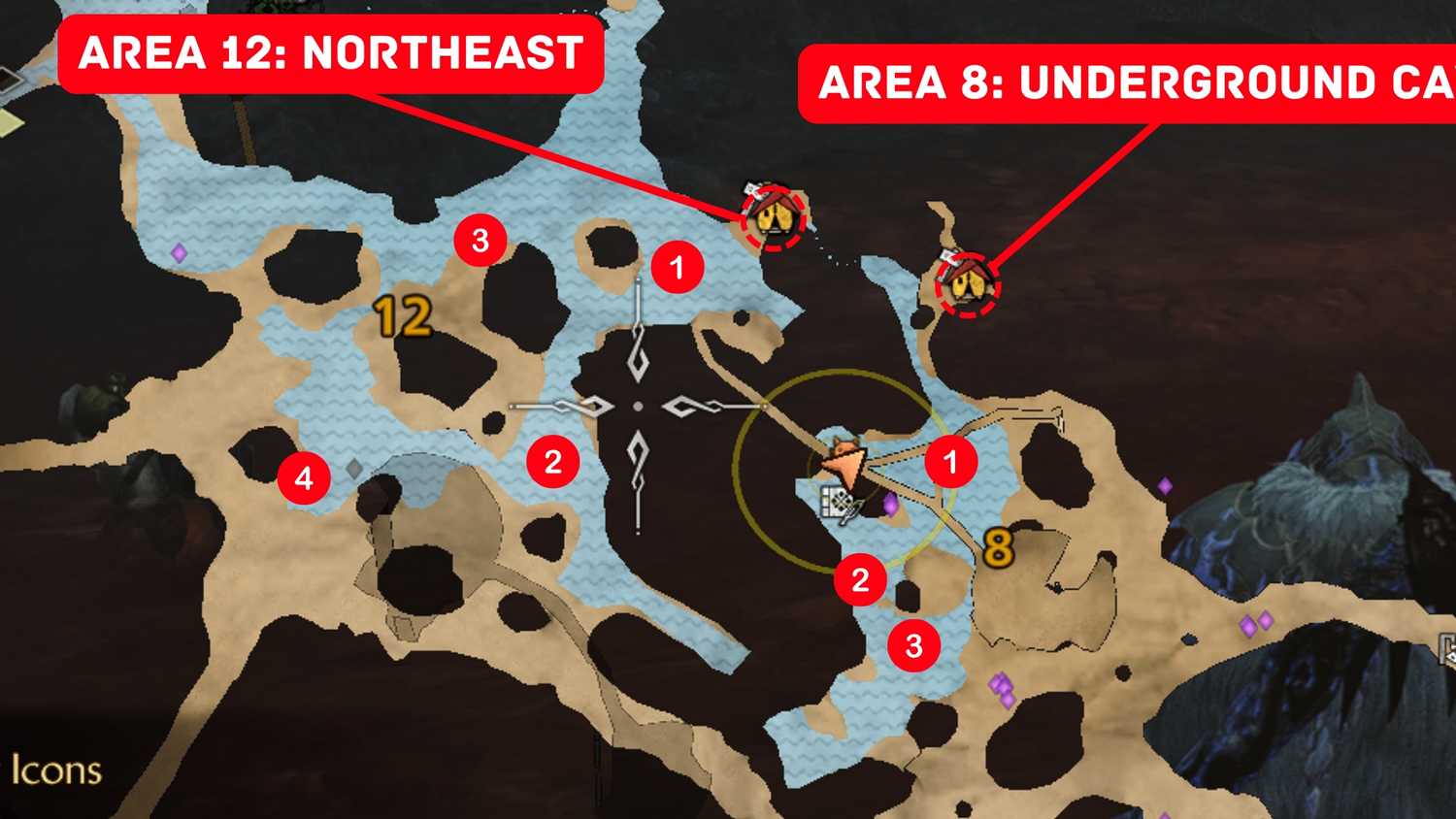 Após completar a rota, volte para a Área 8: Lago Subterrâneo e repita o ciclo. Viajar rápido entre as áreas faz com que os monstros pequenos reapareçam, permitindo que você farme quantas presas aguçadas precisar.