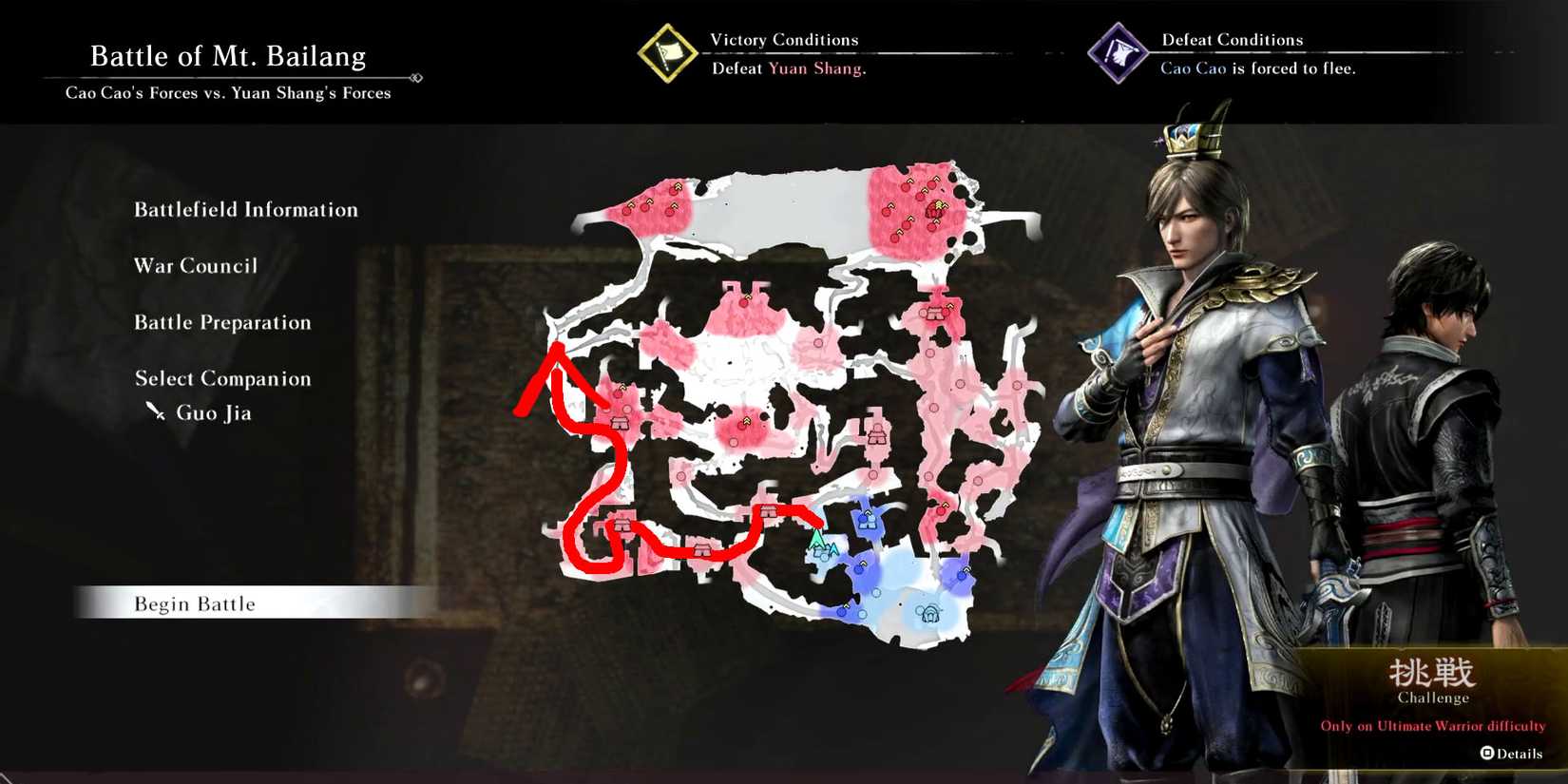 - Persiga Zhuge Liang e force sua retirada da batalha. Você pode enfrentá-lo no altar de oração no canto inferior esquerdo ou interceptá-lo perto da margem sul do rio.