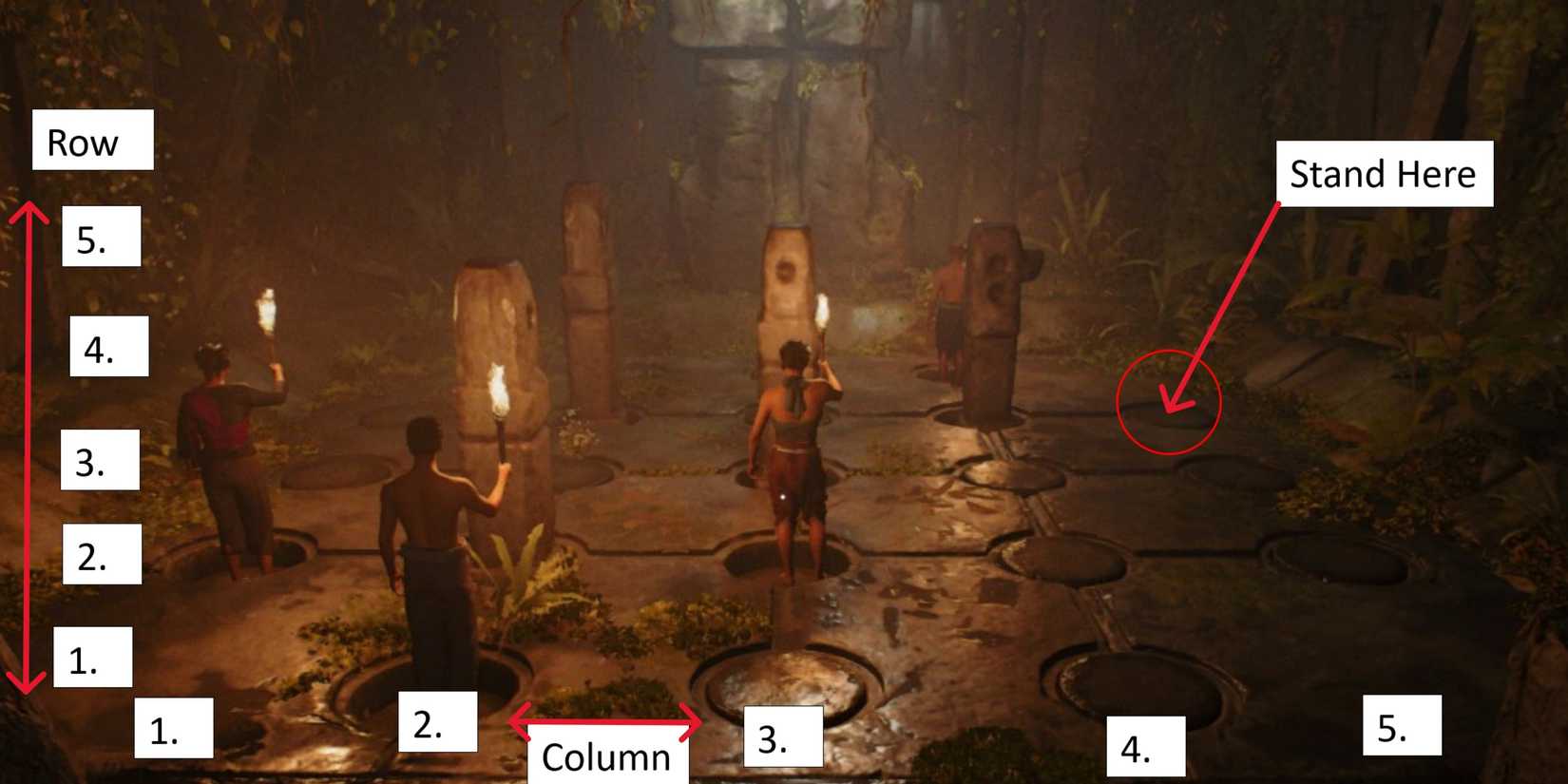 O tabuleiro gigante funciona com placas de pressão que controlam os pilares de pedra. Você pode posicionar até cinco personagens no tabuleiro: Indiana Jones e quatro NPCs. A ordem em que os NPCs são colocados não importa, mas as posições específicas são cruciais para ativar as portas.