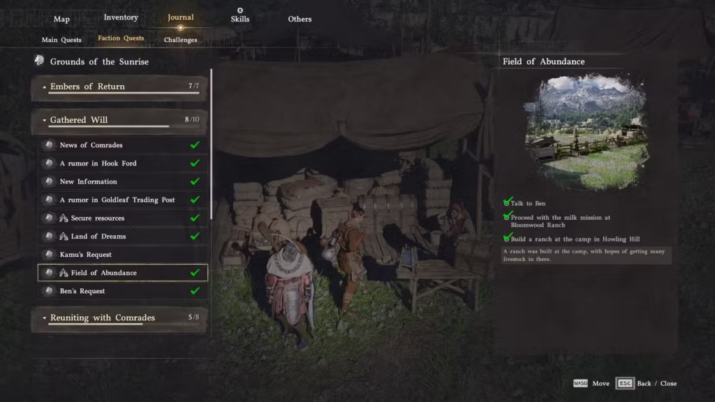 Ben é o encarregado pelas atividades pecuárias. Após encontrá-lo, retorne ao acampamento e fale com ele para iniciar a missão “Campo da Abundância”.