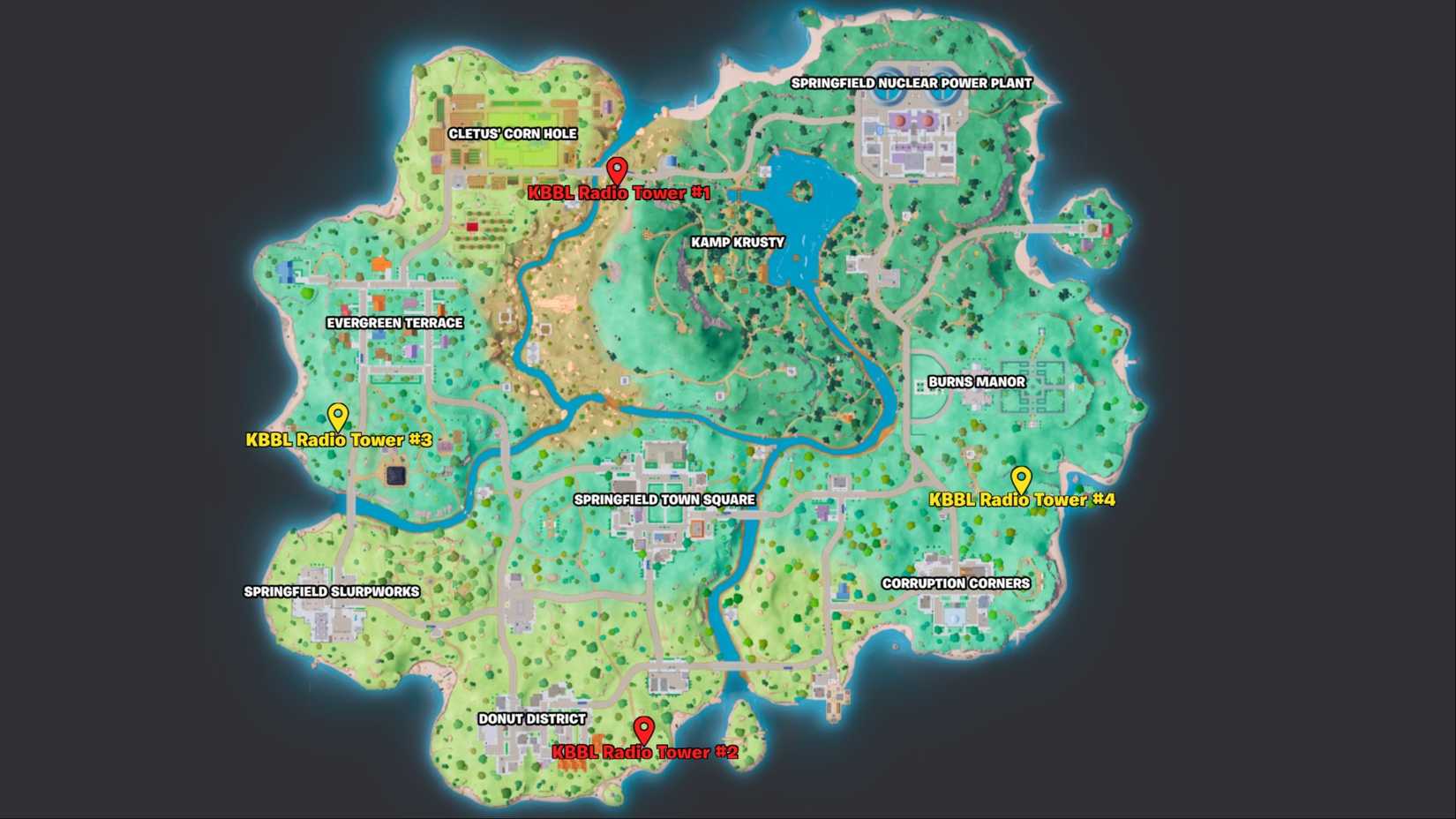 Localização de todas as torres de rádio KBBL dos Simpsons no Fortnite