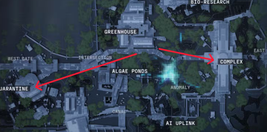 - No mapa Dire Marsh, explore as áreas de Quarentena e o Complexo.