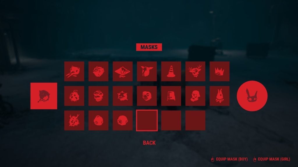 - Cabeça de Veado: Após derrotar as gaivotas com o pé de cabra, suba as duas escadas até o campo de flores. No lado esquerdo do campo, bata no espantalho com o pé de cabra e elimine a criatura que surgirá para pegar a máscara de seu corpo.