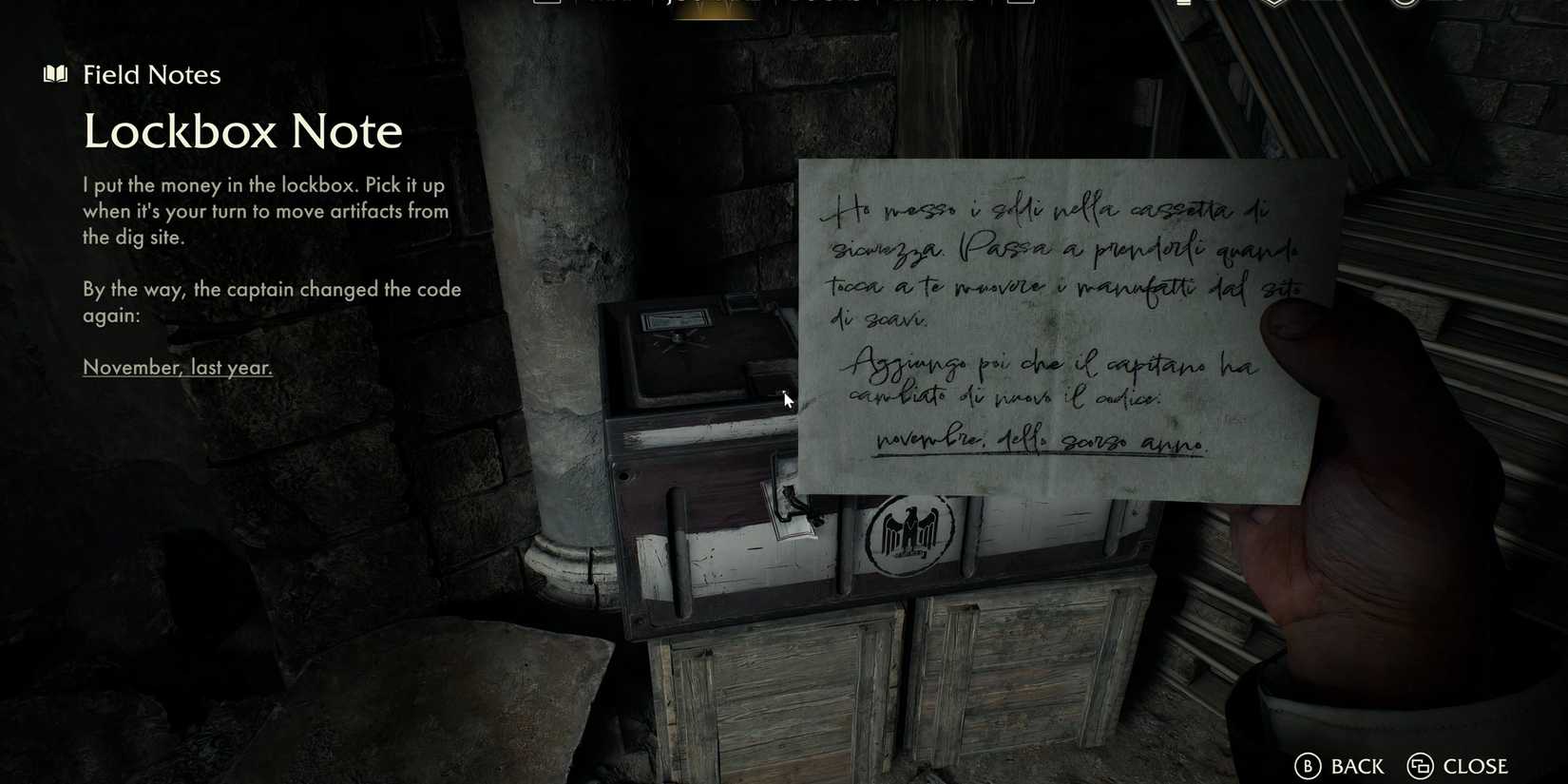 A chave para acessar a combinação está em uma nota encontrada no corpo de um soldado nazista durante o trabalho de campo “A Savage Discovery”.