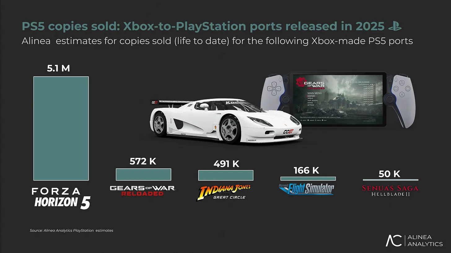 O Alínea Analytics fez um levantamento dos jogos de Xbox mais vendidos no Playstation em 2025 e Forza Horizon 5 lidera com folga. Por outro lado, Hellblade 2 tem vendas inexpressivas no console.