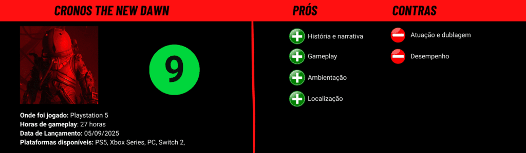 Cronos The New Dawn é um survival horror que bebe da fonte de muitos jogos do gênero, mas ainda assim consegue trazer novidades. Apesar do problema de desempenho e extrema escassez de recursos, o jogo ainda é extremamente divertido e é obrigatório para quem gosta desse gênero.
