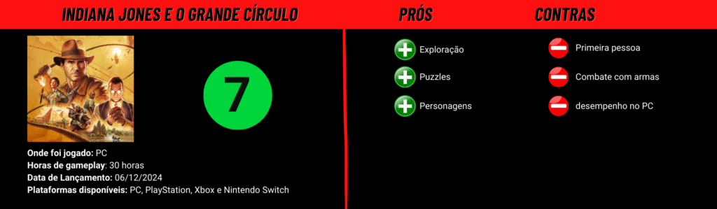 Se você é da geração Tik Tok que gosta de conteúdos rápidos, aqui vai um análise curta do jogo. Indiana Jones e o Grande Círculo é um jogo que transmite a sensação de viver uma aventura de sessão da tarde que seria melhor se tivesse as opção de terceira pessoa.